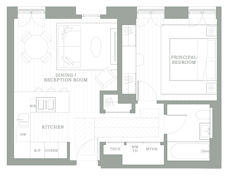 Located on the second floor, Apartment W205 is a beautifully proportioned 1-bedroom residence measuring 53.5 sq m / 576 sq ft, featuring a bright dining / reception room and a well-designed U-shaped kitchen that offers both style and functionality. Premium finishes include timber flooring, bespoke joinery and built-in wardrobes, complemented by underfloor heating and comfort cooling in principal rooms to ensure year-round comfort in a calm, contemporary setting.