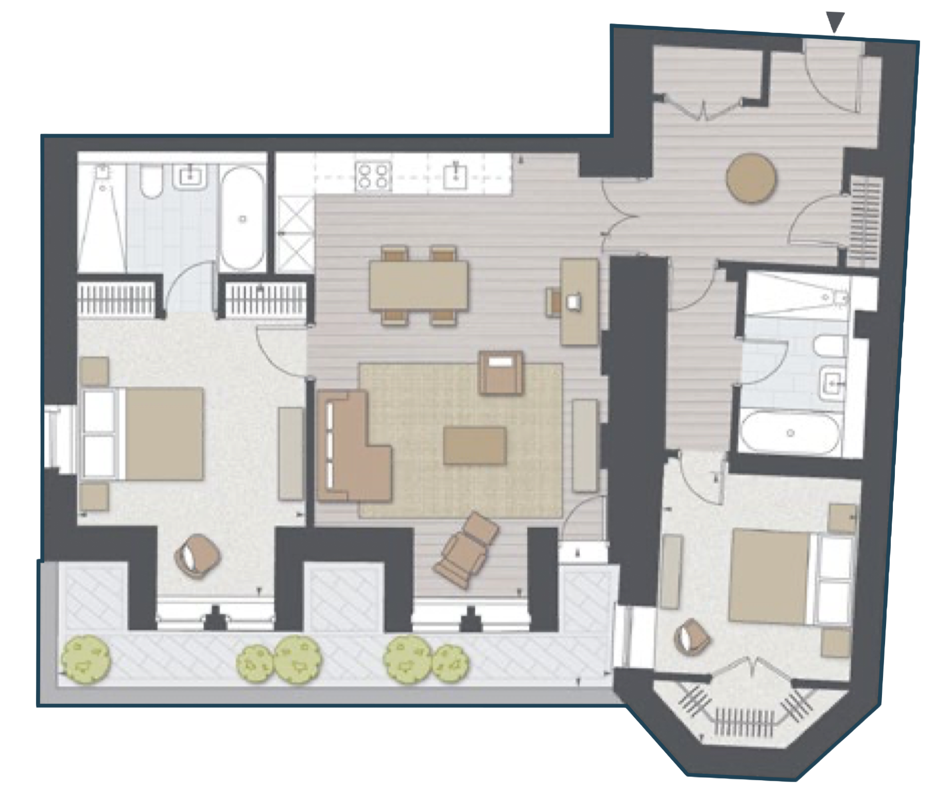 Apartment 32 is a beautifully designed two-bedroom home positioned on the ground floor, offering 97.0 sqm (1,044 sq ft) of well-balanced living space. The spacious open-plan living, dining and kitchen area is complemented by large windows that maximise natural light, creating a bright and welcoming environment for both relaxing and entertaining.