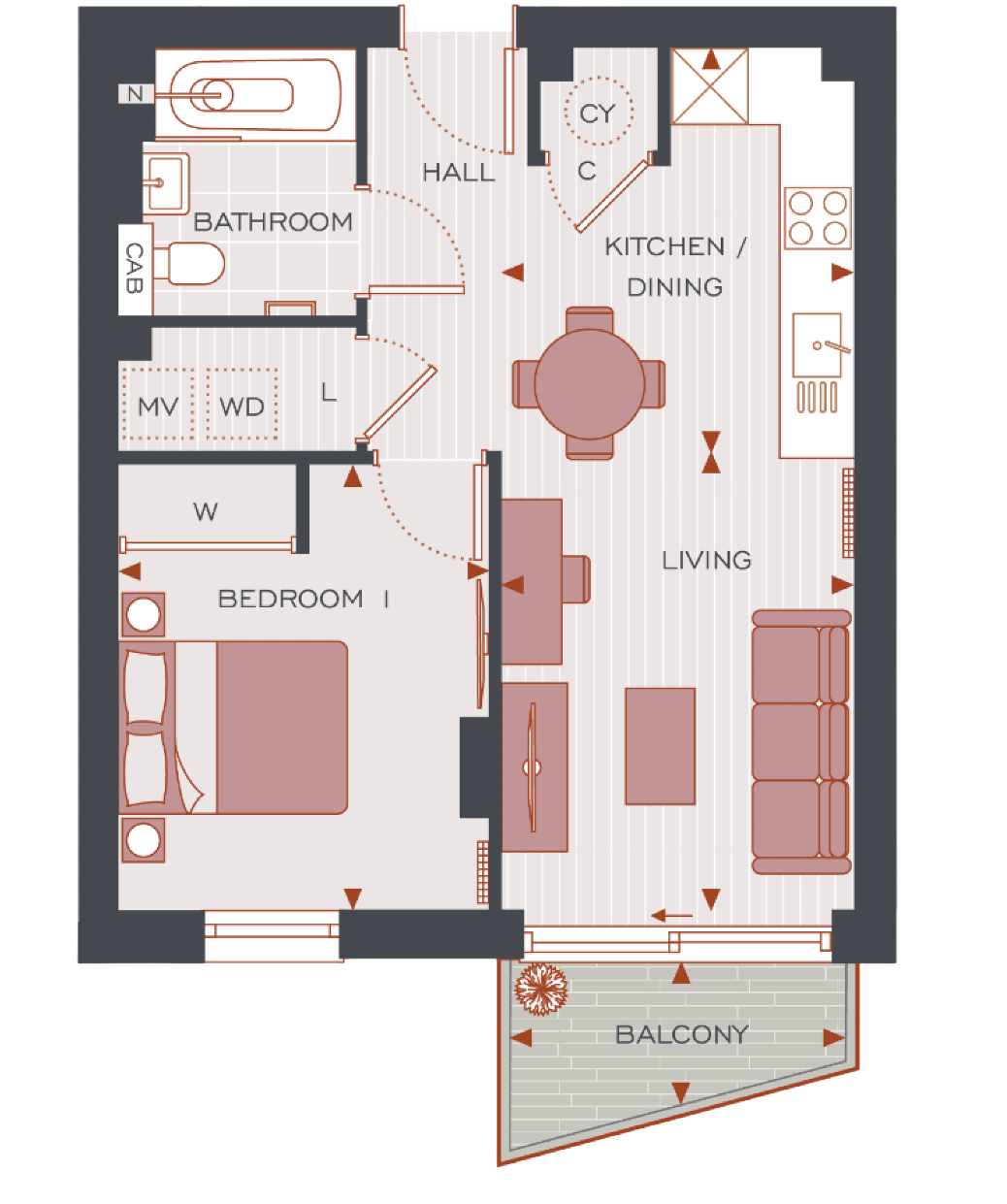 This one-bedroom apartment offers 493 sq ft of well-planned living space, featuring an open-plan kitchen, dining and living area, a modern bathroom, a dedicated utility cupboard with washer/dryer, and a private balcony extending the space outdoors. With its efficient layout and contemporary specification, it provides comfortable day-to-day living with thoughtful storage and bright, inviting interiors.
