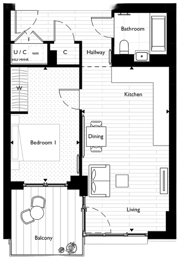 This one-bedroom apartment offers 557 sq ft of efficiently designed living space, featuring an open-plan kitchen, dining and living area that leads onto an 89 sq ft private balcony, along with a well-proportioned bedroom with fitted wardrobe, a contemporary bathroom, a dedicated utility cupboard and additional storage. Finished with LVT flooring to the living areas, carpeted bedrooms, Bosch integrated kitchen appliances, composite stone worktops and modern bathroom fittings, it provides a bright, comfortable and practical home layout ideal for everyday living.